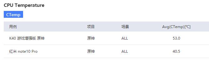 从表格中可以看出, Note 10 Pro 的游戏帧数和 K40 玩家增强版基本持平,而在整体的测试的过程中, Note 10 Pro 的发挥会更稳定一些,基本没有掉帧或者是卡顿的情况出现。CPU 的发热控制的极好,基本在 40 度左右,尽管测试的当天杭州因为下雨气温在 20 度左右,但托尼觉得这温度控制还是很出色的。