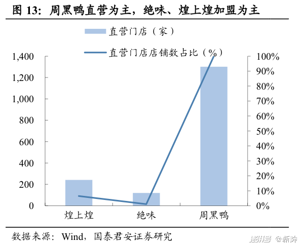 图:绝味、煌上煌、周黑鸭三家直营店门店数量、占比比较(来源:wind,国泰君安证券研究)