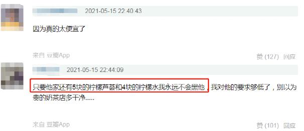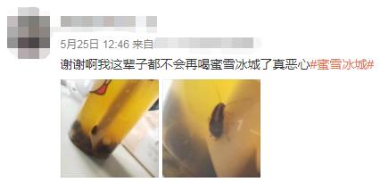 蜜雪冰城东窗事发十天后,一位东北网友发微博吐槽,“我这辈子都不会再喝蜜雪冰城了”。配图里,一只无需点大也能看清的蟑螂,正游荡在满杯百香果茶里。