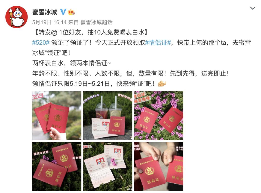 蜜雪冰城能够在年轻人心里独得恩宠,除了便宜大碗的优势之外,也与它无孔不入的营销分不开。去年“5·20”开始,蜜雪冰城就推出了一年一度的领情侣证的创意营销。
