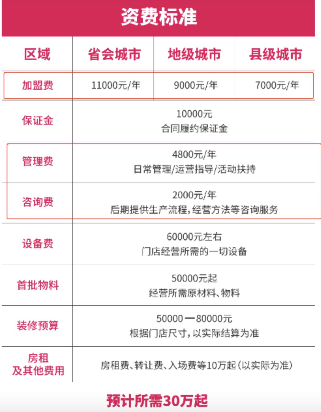 蜜雪冰城早年在官网上列出的加盟预算。在县级城市开一家蜜雪冰城,加盟费仅为7000元/年,但算上设备费、原料费、保证金、管理费、咨询费、门店装修费用等,需要交给蜜雪冰城总部的费用至少在20万元。