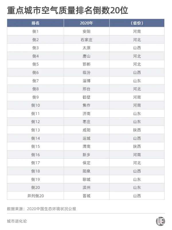 比如河北保定,虽然一直在榜单中,不过倒数位数逐年提高;比如河南郑州、陕西西安,过去是榜单常客,2020年的空气质量不再是倒数20名的序列。