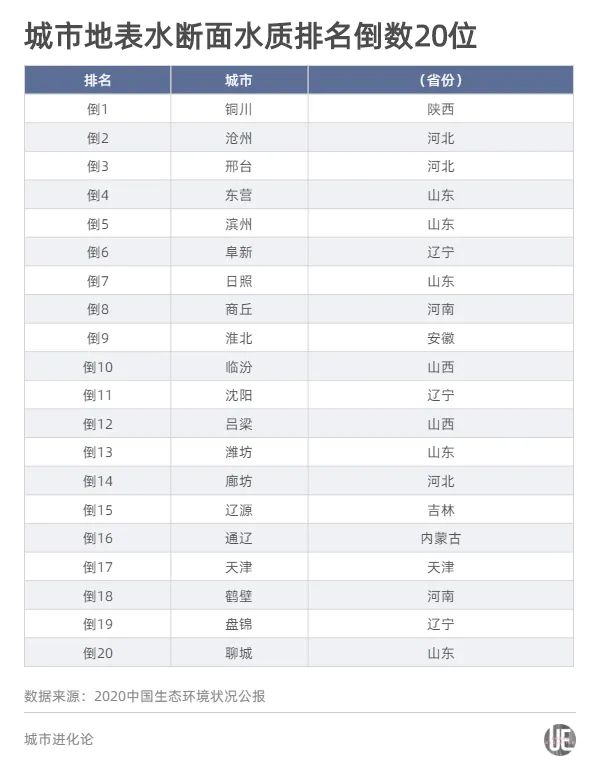 铜川、沧州、邢台等城市国家地表水考核断面水环境质量相对较差。对比空气质量城市排名来看,河北邢台、山东滨州、山西临汾、河南鹤壁、山东聊城,这五座城市无论是空气质量还是地表水质,都排名倒数,大气、淡水生态环境较差。