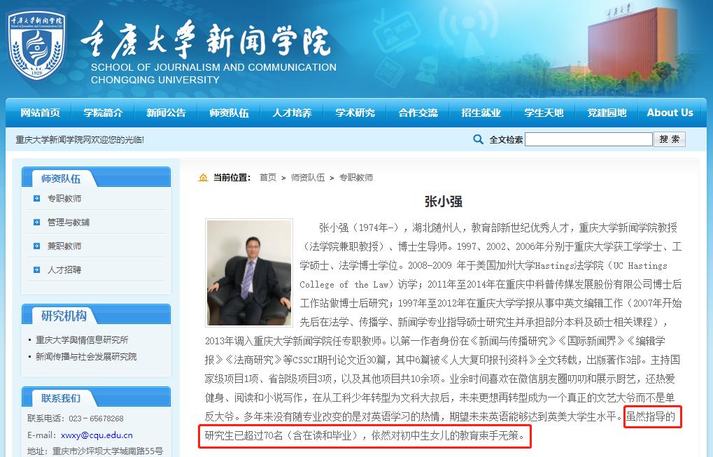 张小强坦言,两年多以前学院要更新官网,正是因为自己对辅导女儿作业深有感触,所以把那句“虽然指导的研究生已超过70名(含在读和毕业),依然对初中生女儿的教育束手无策”写进了个人介绍里。他认为,官网对于教师的介绍,没必要只展示学术成绩,“我们做传播的,应该有不一样的、个性化的东西”,让学生更加全面地了解老师,也希望培养的研究生热爱生活,关注到生活的细节。