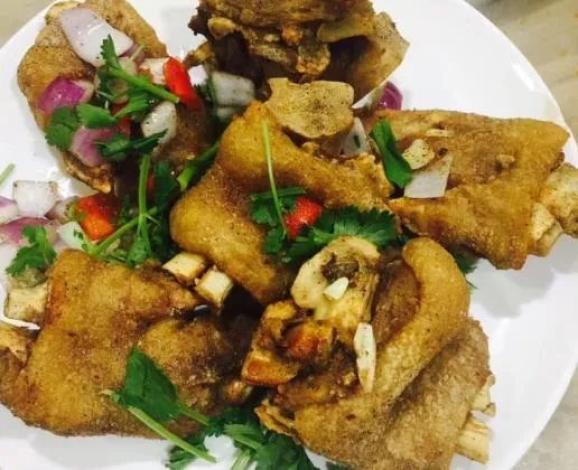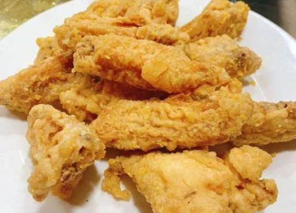 咸蛋黄鸡翅是店家的第一大招牌,也是典型的排挡“模子菜”之一。只带中间一根骨头的中翅,裹上面粉再撒上细碎的咸蛋黄,过油炸透就可以上桌了。咸蛋黄自带讨喜的体质,和松软可人的鸡肉配起来就显得很搭。外酥内嫩中还带着咸蛋黄沙沙的口感,嗲!椒盐猪蹄,一盘3只对半切开的猪蹄,上桌的同时一股浓浓的椒盐味扑鼻而来。分布在表面密密麻麻的椒盐先给口腔带来第一轮冲击,第二轮是被炸到酥脆的猪皮,最后是软糯粘牙的蹄筋。酱爆猪肝毫无异味,鲜嫩滑润,很是下饭,口味甚至超过了很多本帮名馆。