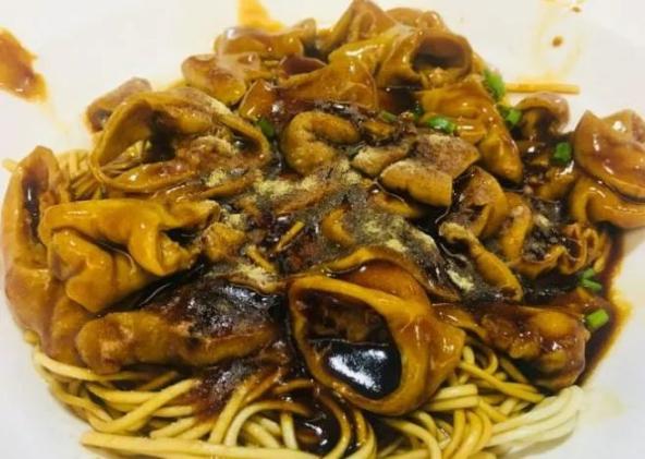 这家面馆主打的特色是大肠双浇面,猪肝双浇面,主打内脏系列。最大的特色是,面汤很少,面和浇头全部融在了汤里。现炒的浇头油很足,炒得很香,面条有点粗,比细面更加Q弹。大肠特别有嚼劲,没有过多的油脂和腥气,鲜香没有杂味,而且用的是烤鸭的卤汁,让大肠口感更加的油润。