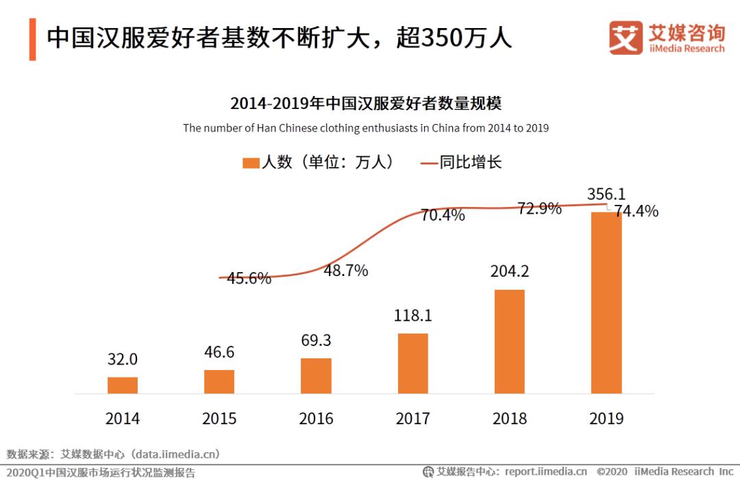 艾瑞数据报告显示《2021Q1 汉服产业报告》报告显示,2019 年中国汉服爱好者约合 350 万人,以单间汉服消费中位数 300-500 计算,2019 年汉服市场规模约合 10.5 亿-17.5 亿元左右。不足 20 亿的市场规模明显很难打动投资人。但这并不意味着汉服市场中的所有品牌都不值得投资,某汉元素品牌发起人告诉我们,目前一些汉服品牌拿到融资,依靠的是品牌附加价值。
