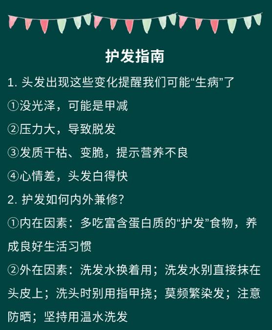 建议平时多吃些鱼类、豆类、绿叶蔬菜、动物肝脏、核桃、芝麻等富含蛋白质的“护发”食物,帮助强健发质。同时,养成良好生活方式,不熬夜、学会排解坏情绪、劳逸结合。二、外在因素: