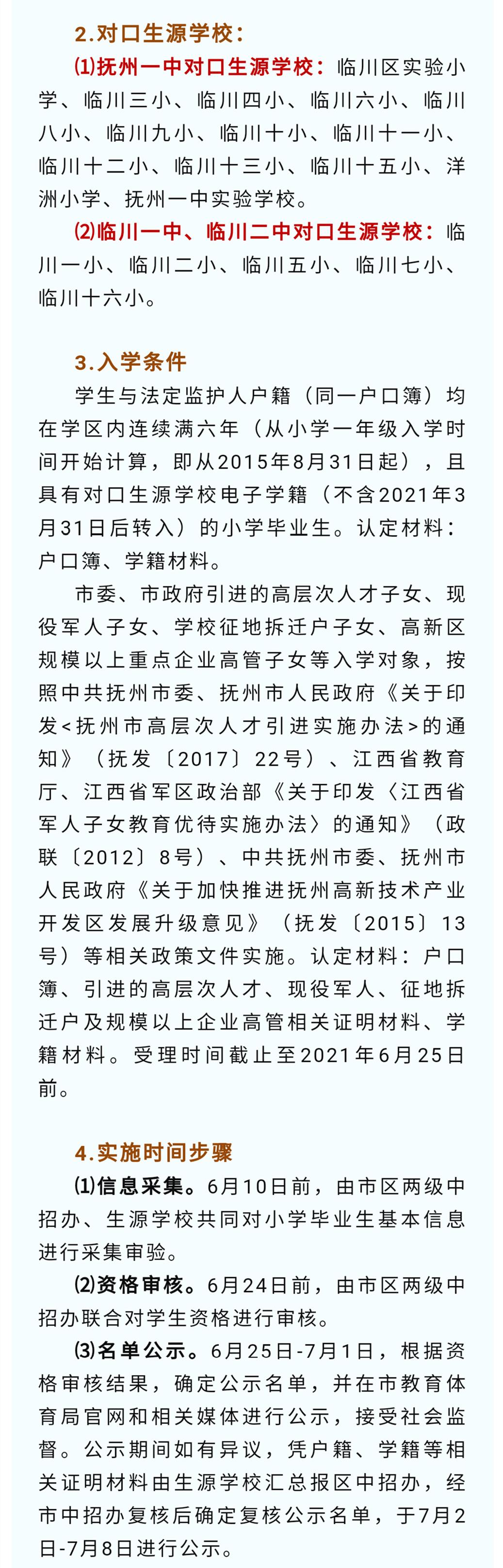 为全面贯彻落实《中华人民共和国义务教育法》和《江西省义务教育条例》,严格执行《江西省教育厅关于做好2021年全省普通中小学招生入学工作的通知》(赣教基字〔2021〕17号)和《抚州市人民政府办公室关于进一步做好严禁市属公办学校非政策性择校工作的通知》(抚府办发〔2018〕60号)规定,结合我市实际,制定本方案: