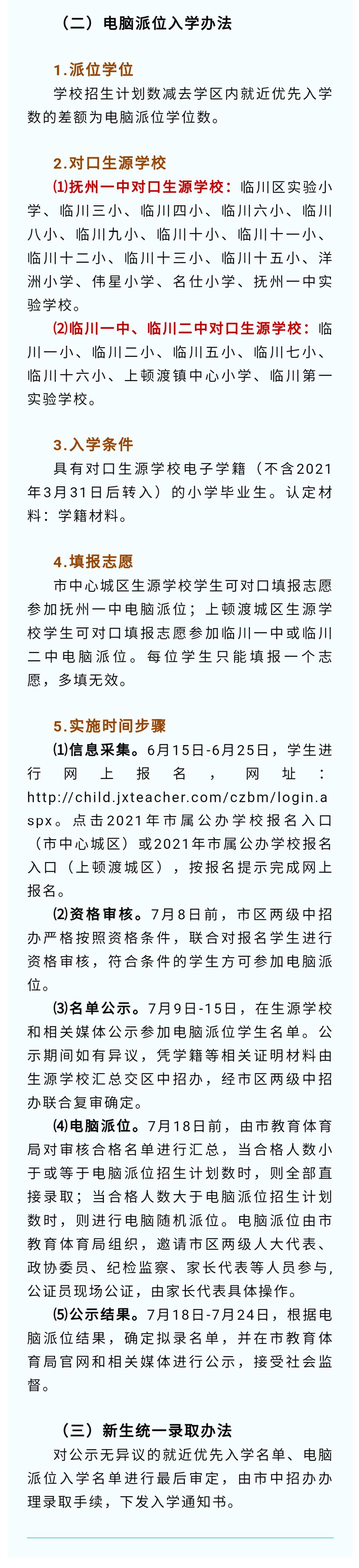 2021年临川教育集团公办学校义务教育免试就近入学坚持就近划片优先与兼顾教育公平相结合的原则,按照划定的学区范围,严格实行学区内就近优先入学与电脑派位入学相结合,全面落实阳光招生政策,确保招生工作依法合规平稳有序。
