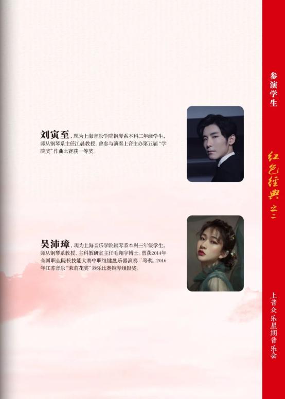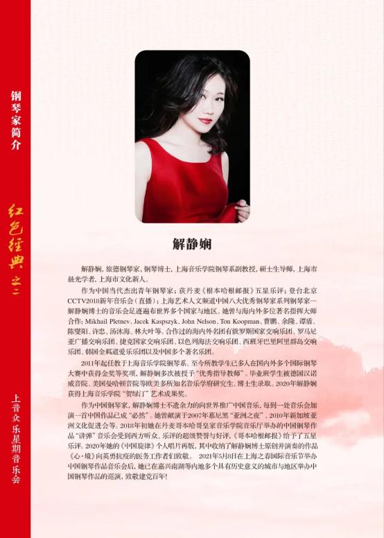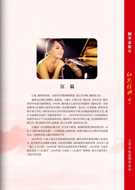 左右滑动查看完整节目册继《牧童短笛》之后,本场音乐会在随后的每一个重要年代,都精选一部作品演奏,包括桑桐的《在那遥远的地方》(1947年)、丁善德的《第一新疆舞曲》(1950年)、王建中分别创作的《浏阳河》(1972年)和《山丹丹开花红艳艳》(1973年)、汪立三的《他山集》(1980年)选段之5——山寨、储望华的《茉莉花幻想曲》(2003年)、张朝的《中国之梦》(2014年),以及两首改编的十六手联弹版作品——王建中改编的《百鸟朝凤》(1972年)与向征今年改编的《歌唱祖国》。