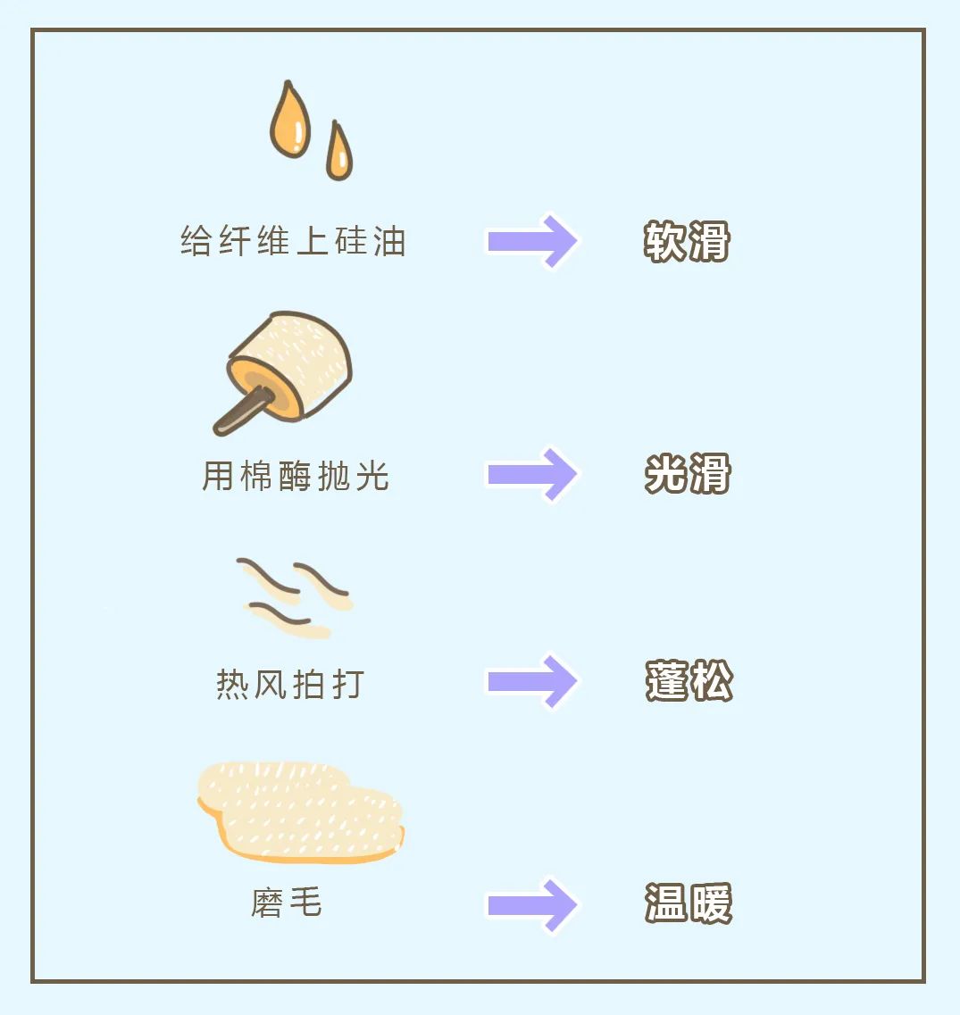 图片来源:丁香生活研究所举个例子,几十年前传统的涤纶是不亲水的塑料线,但现代纺织工业可以在涤纶合成的时候引入亲水性的化学基团,提高它的吸湿性;涤纶腈纶纤维本身容易起静电,但正规厂家都会做抗静电整理,附加成本也不高,效果立竿见影;还可以在纺纱时使用假捻变形丝工艺,让本来弹性不明显的涤纶变得蓬松且富有弹性。