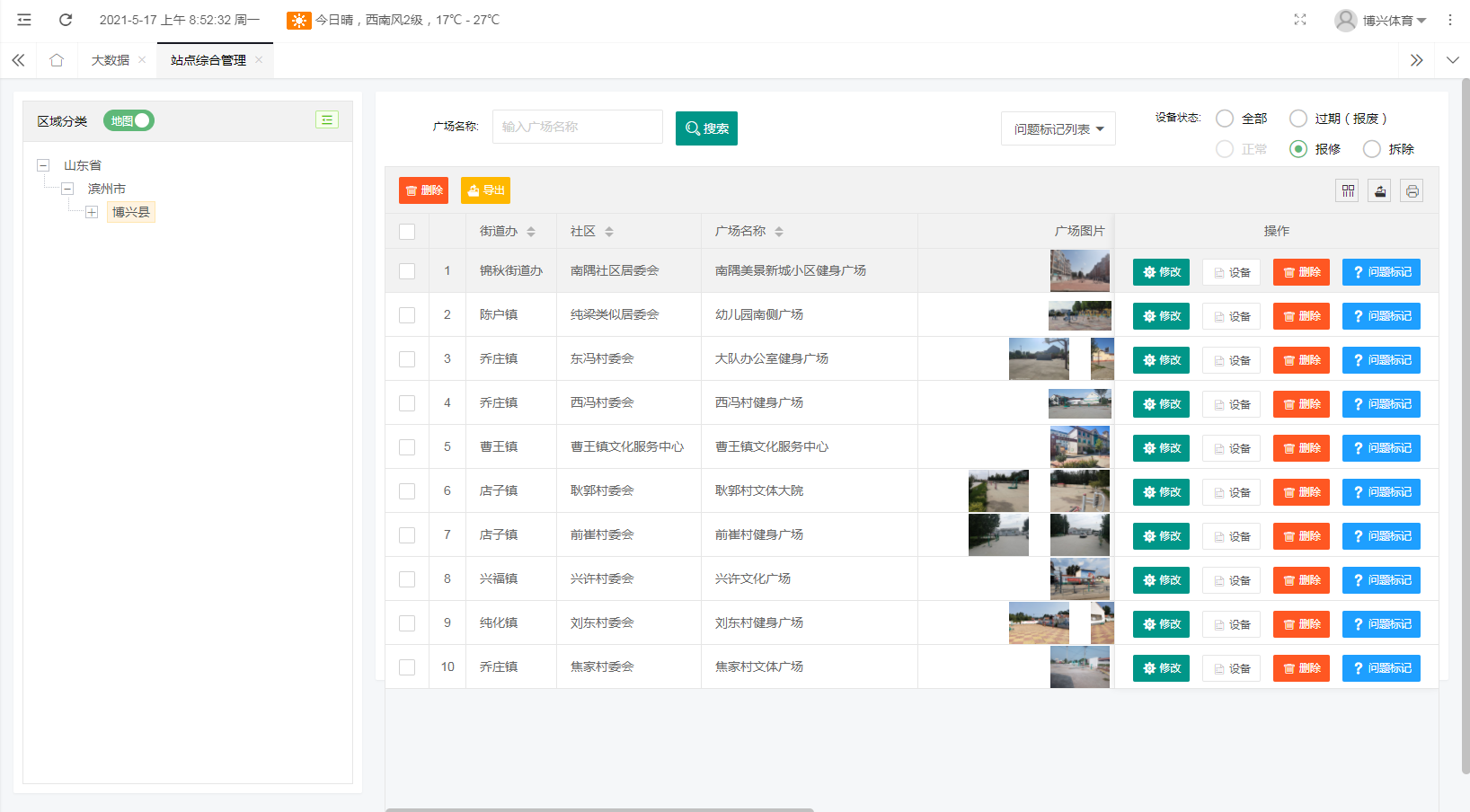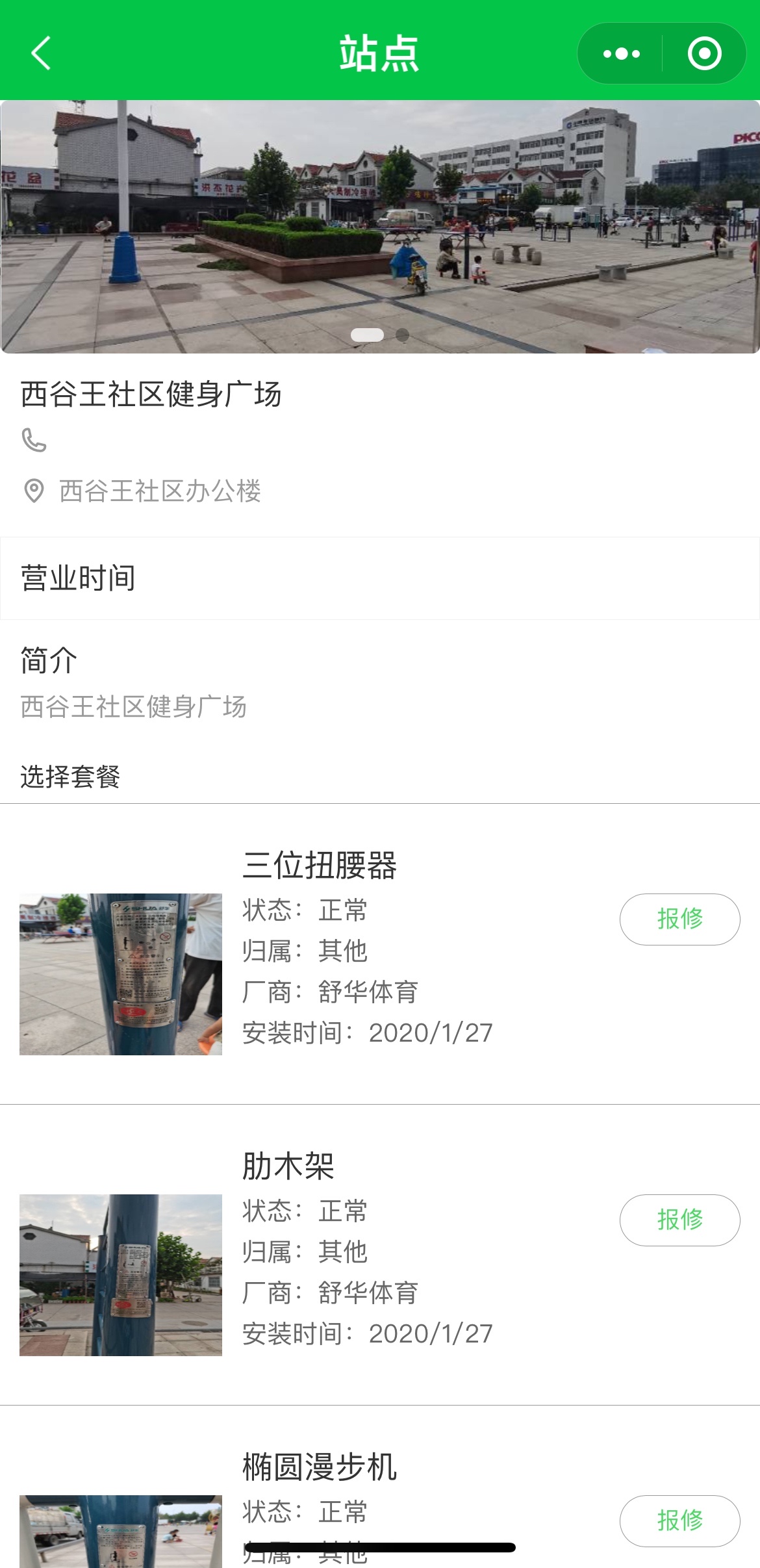 其中,公共体育设施管理维护的“站点”版块里,在地图上用图标标注出了全县12个镇(街道)中各个村里的健身广场上健身器材的使用情况。上方图标栏将健身器材分为室内运动、室外健身、体彩站点、体育公园等多种类别。其中类似“小方块”代表室外健身站点,点击“小方块”,手机下方便显示出健身广场的详细地址,继续点击广场图片,就能清楚地看到里面健身器材的名称、状态、归属、厂商和安装时间。如果市民发现健身器材出现问题,保修期内可以一键“报修”,并可现场拍照或拍摄视频上传,后台接收信息后会第一时间安排相关人员进行处理。