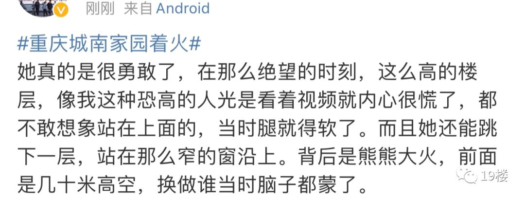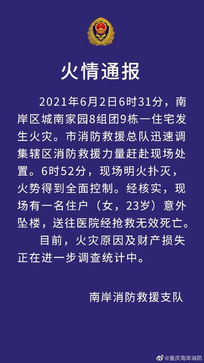 中午11:36,@重庆南岸消防官方微博发布火情通报称:2021年6月2日6时31分,南岸区城南家园8组团9栋一住宅发生火灾。市消防救援总队迅速调集辖区消防救援力量赶赴现场处置。6时52分,现场明火扑灭,火势得到全面控制。经核实,现场有一名住户(女, 23岁)意外坠楼,送往医院经抢救无效死亡。