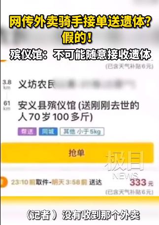 近日,一段外卖骑手接单运送遗体的视频,引发网友热议。该订单显示,送达地点为安义县殡仪馆,订单费用333元。订单备注内容为,刚刚去世的70岁老人100多斤。视频里一段聊天记录显示,用户询问“70岁,100多,可以送吗?”,外卖员回复“外卖啥都能送。”6月2日,记者从安义县殡仪馆获悉,他们没有收到外卖员送过来的遗体。正常情况下,他们只接收殡葬车运送的遗体,不可能随意接收遗体,且需要家属签字和死亡证明。