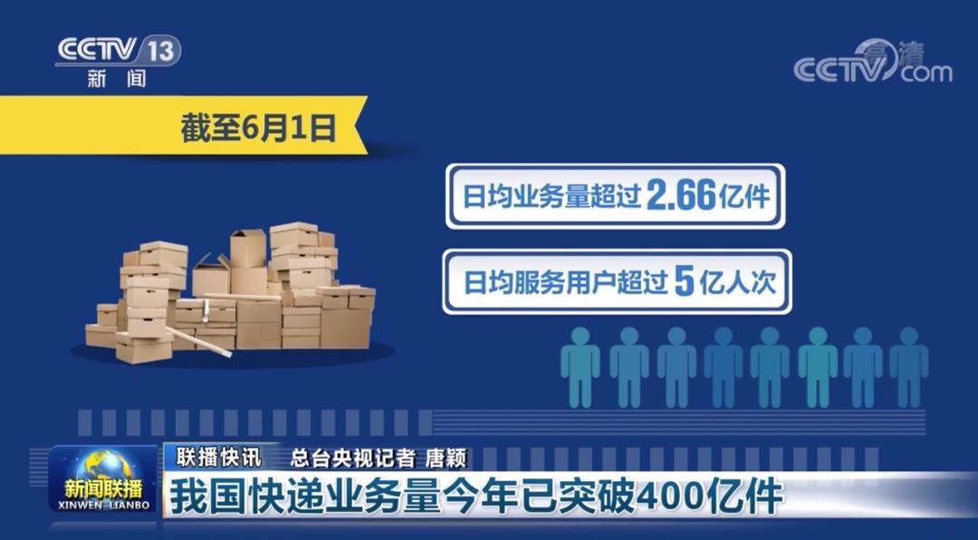 国家邮政局数据显示,截至6月1日,今年我国快递业务量已突破400亿件,日均业务量超过2.66亿件。