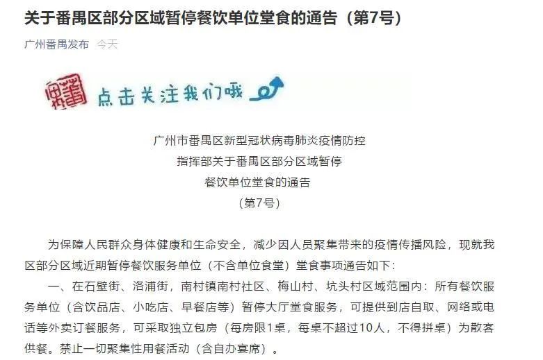 据“广州番禺发布”6月2日消息,广州市番禺区新型冠状病毒肺炎疫情防控指挥部发布关于番禺区部分区域暂停餐饮单位堂食的通告。