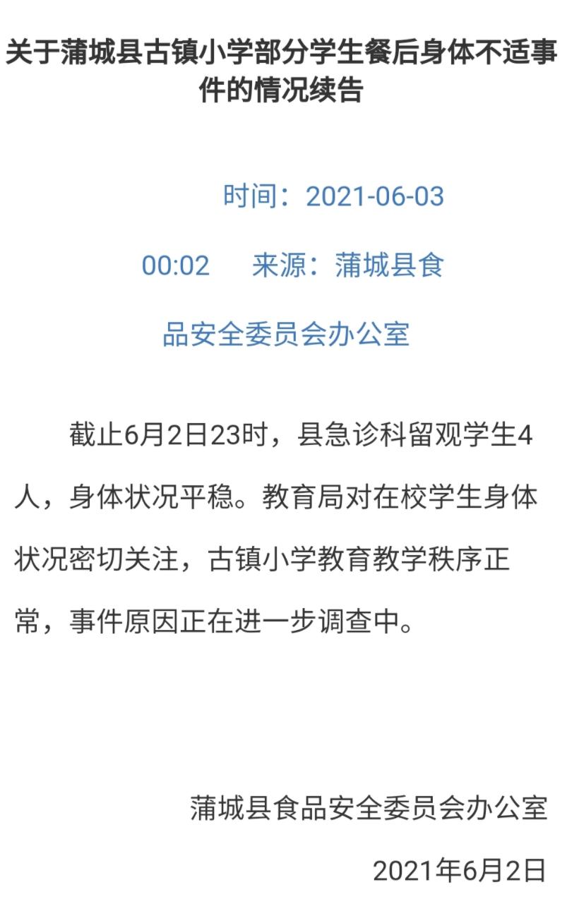 据陕西蒲城县食品安全委员会办公室最新消息,截至6月2日23时,县急诊科留观学生4人,身体状况平稳。蒲城县教育局对在校学生身体状况密切关注,古镇小学教育教学秩序正常,事件原因正在进一步调查中。