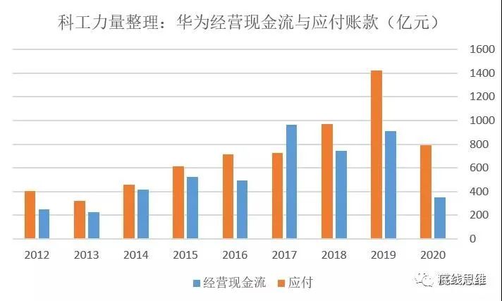 外界通常将此解读为华为应对美方制裁,提前加速备货所致,然而对比2019年华为财报,存货科目数据几乎没有变动,应收账款还有小幅改善,导致经营现金流下降的主要因素,其实是应付账款的减少,从2019年1400亿以上水平,暴跌至去年的789亿。