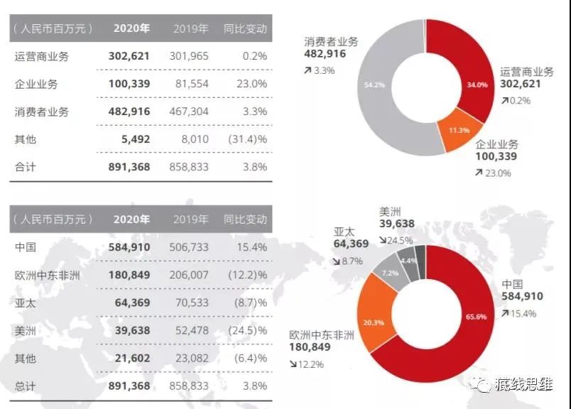 华为公司的营收数据,有“两个过半”的鲜明特点:消费者业务营收占比过半、中国市场营收占比过半。