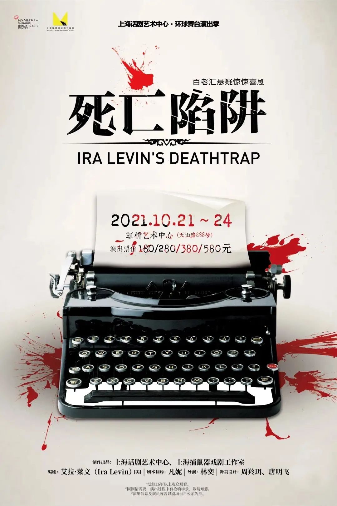 故事梗概:百老汇著名悬疑剧作家西德尼现已风光不再,江郎才尽的他正利欲熏心地窥视自己学生克里弗德创作的新剧——《死亡陷阱》,满心期待将此剧署上自己的名字以在百老汇重振雄风。为了达到目的,他决定铤而走险,将克里弗德诱至家中并设计将其杀死,妻子麦拉目睹了一切,惊恐万分。但事情的发展却完全出乎意料,神秘的邻居意外拜访,打乱了局面,原本计划中的“死亡陷阱”似乎并没有成功。故事仍在继续,“陷阱”之外似乎还有更大的阴谋,究竟谁会踩入真正的“死亡陷阱”?制作出品:上海话剧艺术中心、上海捕鼠器戏剧工作室 | 出品人:张惠庆 | 总监制:田水 | 艺术总监:喻荣军 | 监制:童歆 | 制作人:吴嘉、陶然 | 编剧:艾拉·莱文(Ira Levin)[美国] | 剧本翻译:凡妮 | 导演:林奕 | 舞美设计:周羚珥、唐明飞 | 制作经理:金广林 | 舞台监督:王飞 | 作曲:吴骏浩 | 灯光设计:陈璐 | 复排灯光设计:陈依丛 | 造型设计:徐丛婷 | 道具设计:郁树西 | 音效设计:丁毅 | 技术设计:袁向前、胡继胜 | 舞美制作监理:赵明
