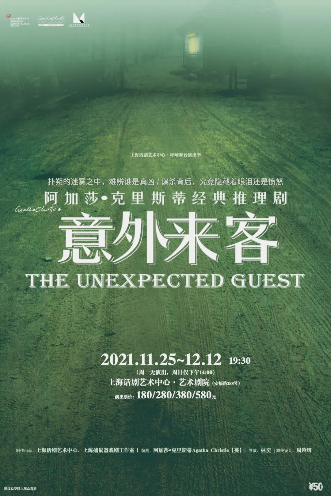 故事梗概:在迷雾中,倒霉的斯达韦德把车开进了沟里,他只能徒步来到附近的一所住宅求救。没想到却踏入了一个谋杀现场——劳拉•沃尔克正站在已经身亡的丈夫身旁,手中紧握着一把枪……她承认是她杀了丈夫。看着这位美丽而无措的妻子,斯达韦德答应尽力帮助她。可是,劳拉为什么要承认罪行?是在掩护什么人——丈夫心智不全的弟弟,或是来日无多的母亲,还是她自己的情人?而管家贝尼特小姐、男仆安杰尔的行为似乎也都别有用心,而劳拉自己看上去也摇摆不定。似乎人人都有嫌疑,当然真相只有一个,但这一次,谋杀背后隐藏的究竟是什么?制作出品:上海话剧艺术中心、上海捕鼠器戏剧工作室 | 出品人:张惠庆 | 总监制:田水 | 艺术总监:喻荣军 | 制作人:吴嘉、童歆 | 编剧:阿加莎•克里斯蒂Agatha Christie[英国] | 导演:林奕 | 舞美设计:周羚珥 | 制作经理:金广林 | 灯光设计:陈璐 | 造型设计:徐丛婷 | 道具设计:郁树西 | 音效设计:丁毅 | 技术设计:赵明 | 执行制作:陶然