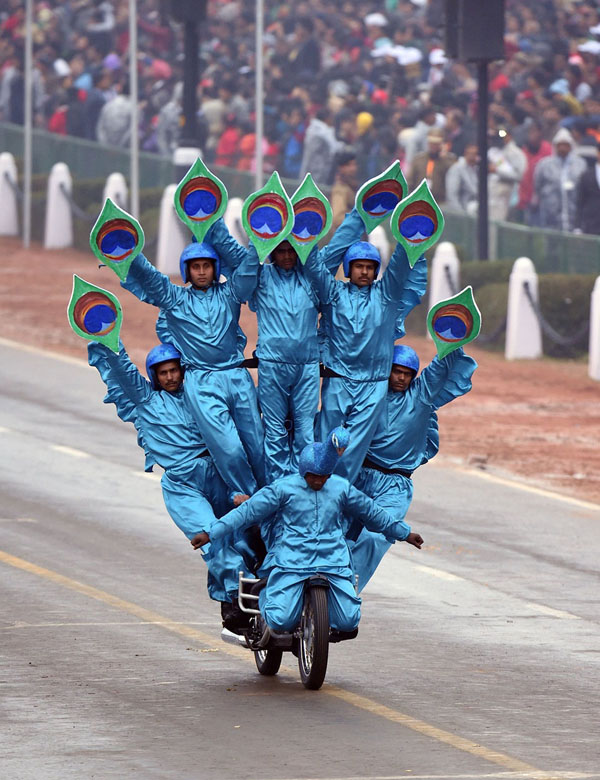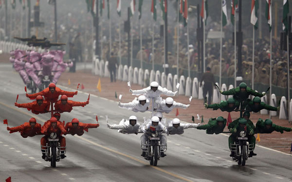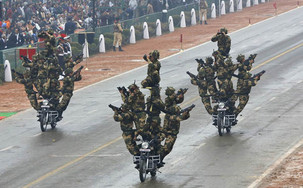 至于为什么要在阅兵时表演杂技,媒体推测印度方面一是要表现杂技之乡、曲艺之邦的大国风范,与中国叫板;二是展现其独特的军事力量。印度国防部曾发布《杂技作为军事力量的可行性报告》,印度军人从小研习传统功夫,练习缩骨术、瑜伽术,擅长在狭小的空间聚集大量的兵力。对印度军队而言,可以轻易地在一辆摩托车上站上整支足球队,头顶还能顶着军需物资,强大的机动性和运输能力令任何国家的军队胆寒。