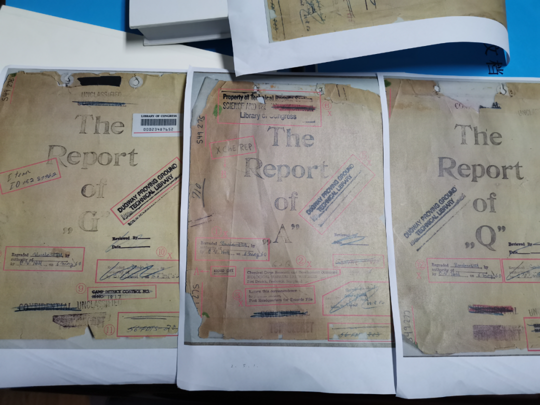 据侵华日军第七三一部队罪证陈列馆研究员杨彦君介绍,这三个报告封面标识分别写有:“马里兰州德特里克堡基地生物战实验室化学部队研究与开发部,此函归还至战后总部档案部”,盖有“达格威实验基地技术图书馆”的黑色墨印。