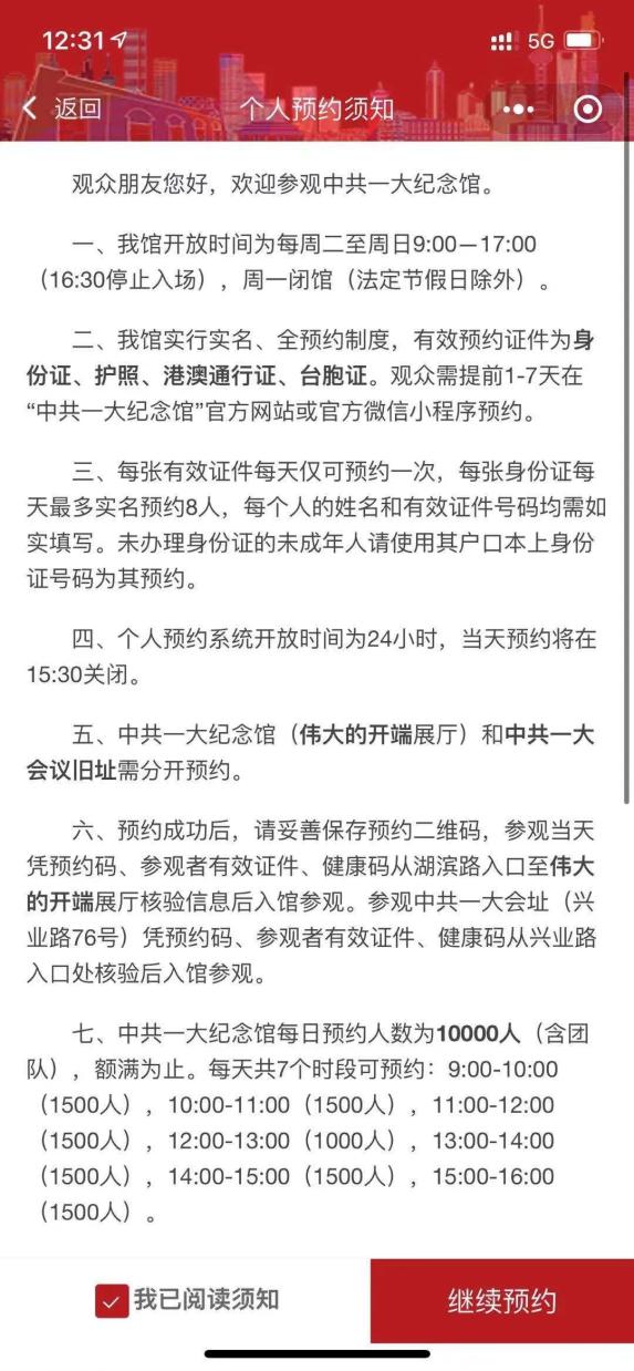 中共一大纪念馆每日预约人数为10000人(含团队),额满为止。每天共7个时段可预约:9:00-10:00,10:00-11:00,11:00-12:00,12:00-13:00,13:00-14:00,14:00-15:00,15:00-16:00。