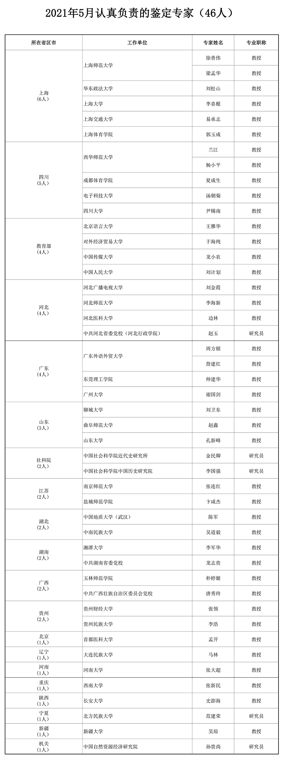 近日,全国哲学社会科学工作办公室在官网上公布了《2021年5月认真负责的鉴定专家》名单,共计46人。