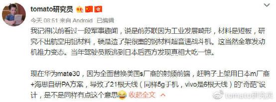 根据网友“tomato研究员”拆解,华为Mate 30的功率放大器、低噪声放大器,是由海思自研,另外还使用了两颗卓胜微的开关。
