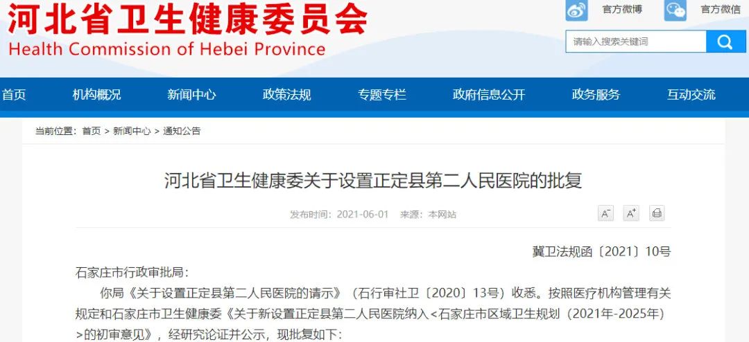 《批复》显示,石家庄市行政审批局《关于设置正定县第二人民医院的请示》(石行审社卫〔2020〕13号)收悉。按照医疗机构管理有关规定和石家庄市卫生健康委《关于新设置正定县第二人民医院纳入