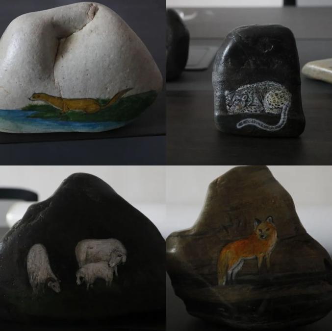 紧锣密鼓地,他又在全县范围内物色出有一定绘画基础的23名生态管护员,在北京某画家的资助下,成立了“帐篷美术队”,即以黄河石、长江石为纸,以三江源国家公园丰富的动植物资源为素材,绘制成一幅幅生动逼真的“石头画”。效率高、技术好的队员一年可以绘制100余幅作品,以300元的均价在线上销售,远销上海、浙江、内蒙等地,颇受外地客户喜爱。如此算下来,队员们最高收入在3万元左右,最低的也能挣到7000元左右。队员们大致也未曾料想,平平无奇的满山的石头,竟然也能化作口袋里的财富。