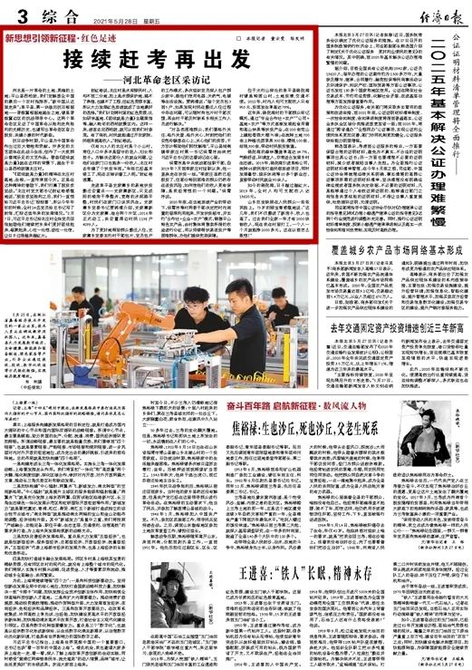 经济日报5月28日第03版刊发《接续赶考再出发 ——河北革命老区采访记》。阜平县,第一块敌后抗日根据地——晋察冀根据地诞生之地,曾是晋察冀边区的抗战领导中心,这里见证了中国革命从胜利走向胜利的光辉历史,也谱写出革命老区人民奋力脱贫、共建小康的时代新曲。1