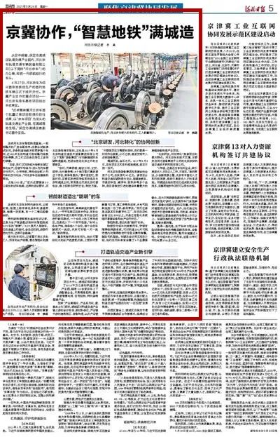 河北日报5月24日第05版刊发《京冀协作,“智慧地铁”满城造》。4月27日,河北京车为绍兴首条地铁线生产的首列地铁车辆正式下线并交付。京冀产业合作的重点项目——河北京车造车基地项目结出丰收果实。1