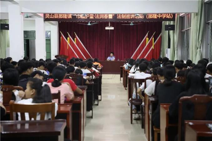 为进一步提高未成年人自觉守法和自我保护意识,从源头上预防和减少未成年人违法犯罪案件的发生,6月1日,灵山县公安局组织民警到那隆镇那隆中学开展“巾帼护童·法润春蕾”法治巡讲活动。