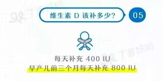 图片来源:丁香妈妈设计团队其中早产儿出生的前三个月,每天需要补充 800 国际单位。