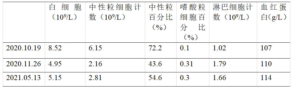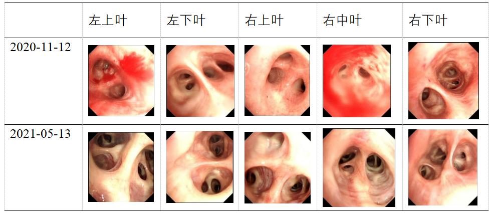 出院半年后复查血常规,感染及炎症相关标记物恢复正常。副流感病毒PCR(-)。全麻气管镜下见双侧支气管黏膜光整,未见明显充血水肿,腔内未见到脓性分泌物。支气管肺泡灌洗液细胞学外观无色透明,细胞总数240个中性粒细胞百分比80%盥洗液奴卡菌涂片、培养、PCR均(-),念珠菌涂片、培养(+),复查胸部CT:与前片对照,肺部病灶较前明显吸收,部分病灶消失。精神,营养状况和活动耐力明显好转,可从事轻体力活动。治疗前后血常规炎性标记物比较结果分别见表1、表2。治疗前后胸部CT及支气管镜下变化对照结果分别见图1、图2。