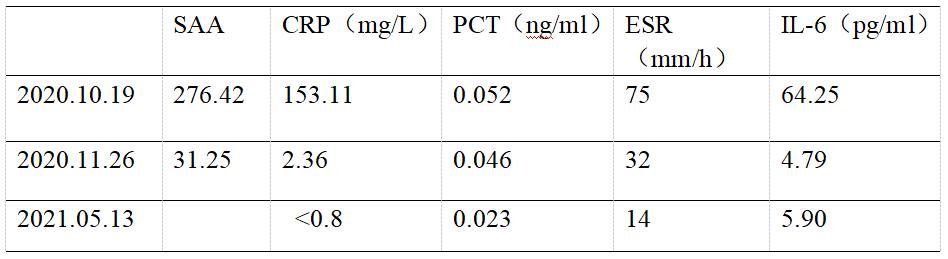 主要辅助检查:入院血常规:WBC 8.52X109/L,NE% 72.2%;血清淀粉样蛋白276.42;CRP 153.11mg/L;PCT 0.052ng/ml;ESR 75mm/h;LPS 166.8pg/L,胸部CT:沿支气管分布的、双肺多发的实变、渗出影,伴树芽征和支气管扩张,实变病灶中可见到小含气囊腔,病变主要累及右肺中叶,左舌叶及双下肺。四肢血管超声未见到静脉血栓。血液肿瘤标记物(-);结缔组织病及血管炎相关化验(-);细胞及体液免疫相关检查(-);痰普通细菌涂片、培养、DNA(-)抗原抗体检测(-)外周血T-SPOT(-),结核杆菌抗体(-),痰抗酸杆菌涂片、培养、特染、DNA,XPERT均(-)非结核分枝杆菌涂片、培养、特染均(-)呼吸道常见病毒PCR DNA(-),RNA(-)。