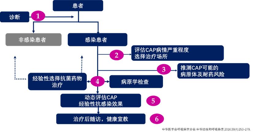 按照我国2016年版《社区获得性肺炎(CAP)诊断和治疗指南》推荐的诊治流程,在诊断CAP之前首先需要排除非感染性疾病引起的肺部病变(CAP的诊治流程图见图3)。