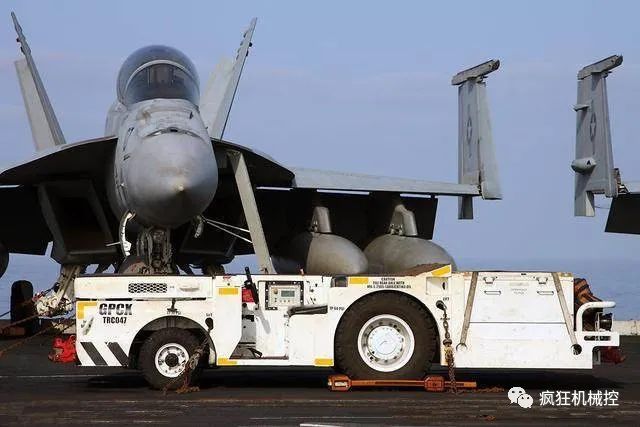 甲板牵引车,是航母舰载机地勤工作的重要角色,它主要用于在降落后牵引舰载机抵达停放位置或是将舰载机转移到起飞位置上。甲板牵引车特制的轮胎和逆向转弯车轮驱动系统,这保证了它拥有足够的牵引力和能够尽可能的减少转弯半径。