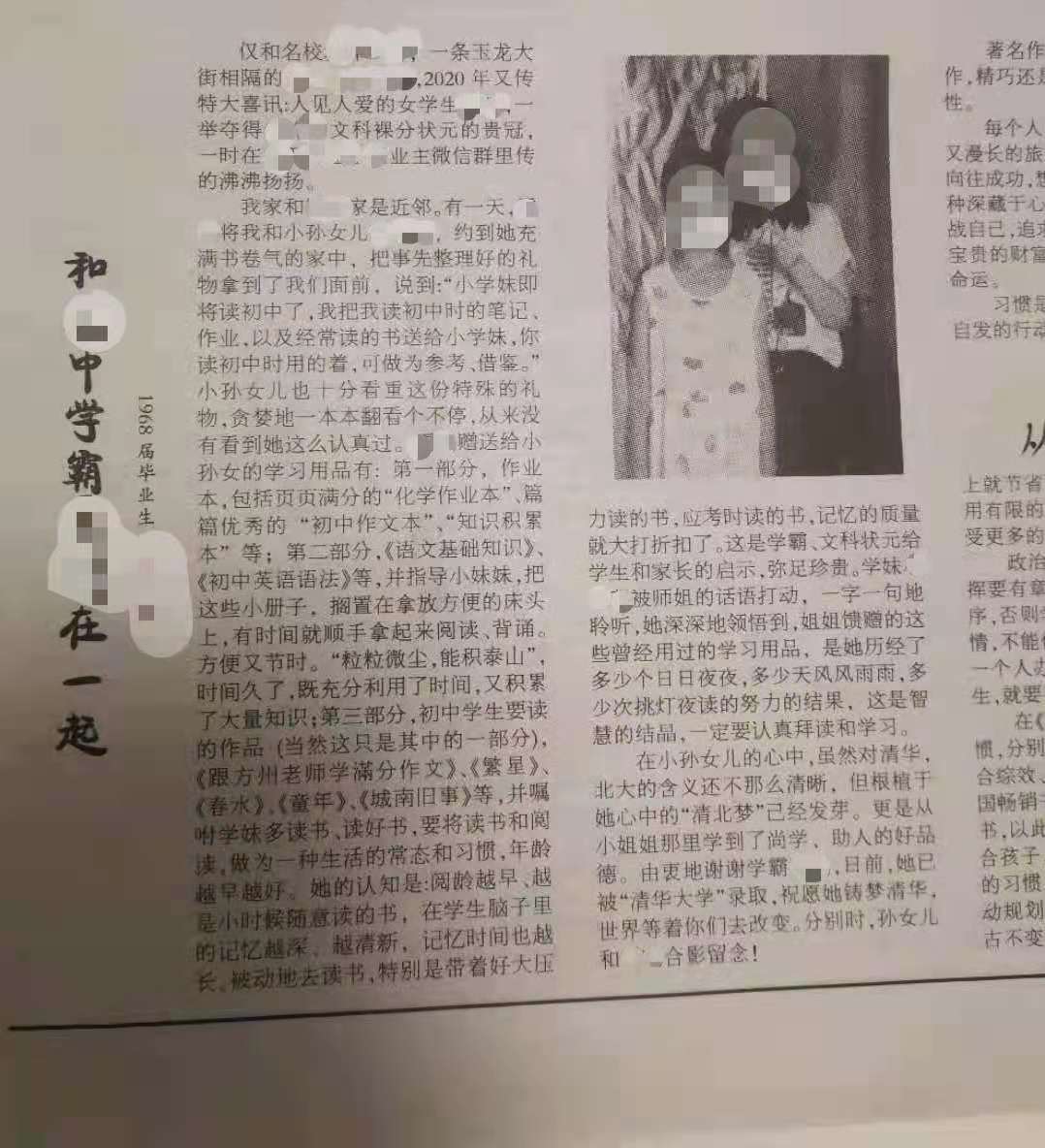 开学后,高中的学弟学妹对夏雨说在校报上看到她了。发来照片后,她发现是这位奶奶投的稿,主要讲了她把学习用品“馈赠”给“学妹”的事迹以及这位“学霸给学生和家长的启示”。首段就气势磅礴:“仅和名校赤峰X中一街相隔的XX小区,2020年又传特大喜讯:人见人爱的女学生夏雨……”“一时在XX小区业主微信群里传的(得)沸沸扬扬”。末尾,奶奶指出,“根植于”小孙女“心中的‘清北梦’已经发芽”。