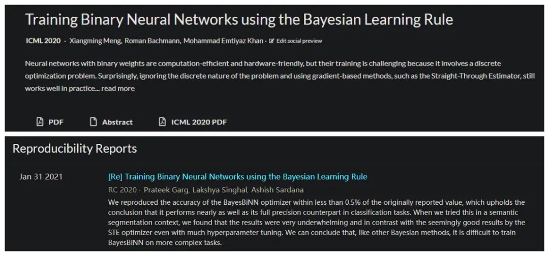 PapersWithCode:论文终于有复现报告了PapersWithCode 以 ICML 2020 论文《Training Binary Neural Networks using the Bayesian Learning Rule》为例展示「论文复现报告」这项新功能。可以看到,PapersWithCode 在论文下方提供了复现报告,包括提交日期和报告摘要。
