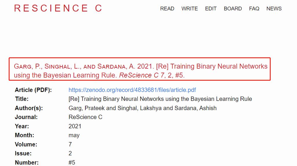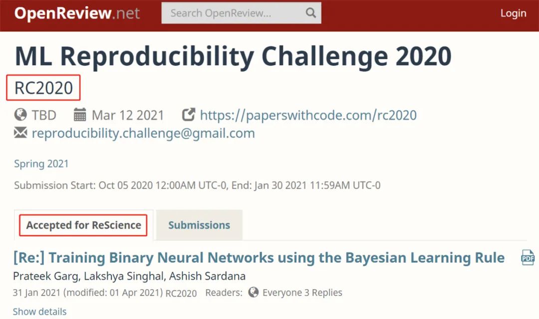 与其他传统科学期刊截然不同,ReScience C 可以说是一个 GitHub 项目,提供了关于计算研究的每个新实现以及评审、解释和测试。PapersWithCode 的示例论文《Training Binary Neural Networks using the Bayesian Learning Rule》就发表在了该期刊上。目前,OpenReview 列出了所有在 RC 2020 挑战赛中被 ReScience C 接收的论文列表。