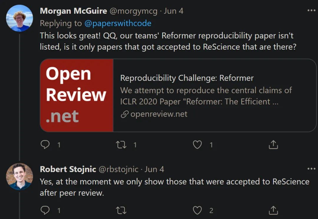 所有的复现报告都将通过 OpenReview 进行同行评审,并显示在 PapersWithCode 网站原始论文的下方。在每年的复现挑战赛中,一批在「洞见性、正确性、逻辑清晰」等方面表现优秀的论文会发表在 ReScience C 期刊上。