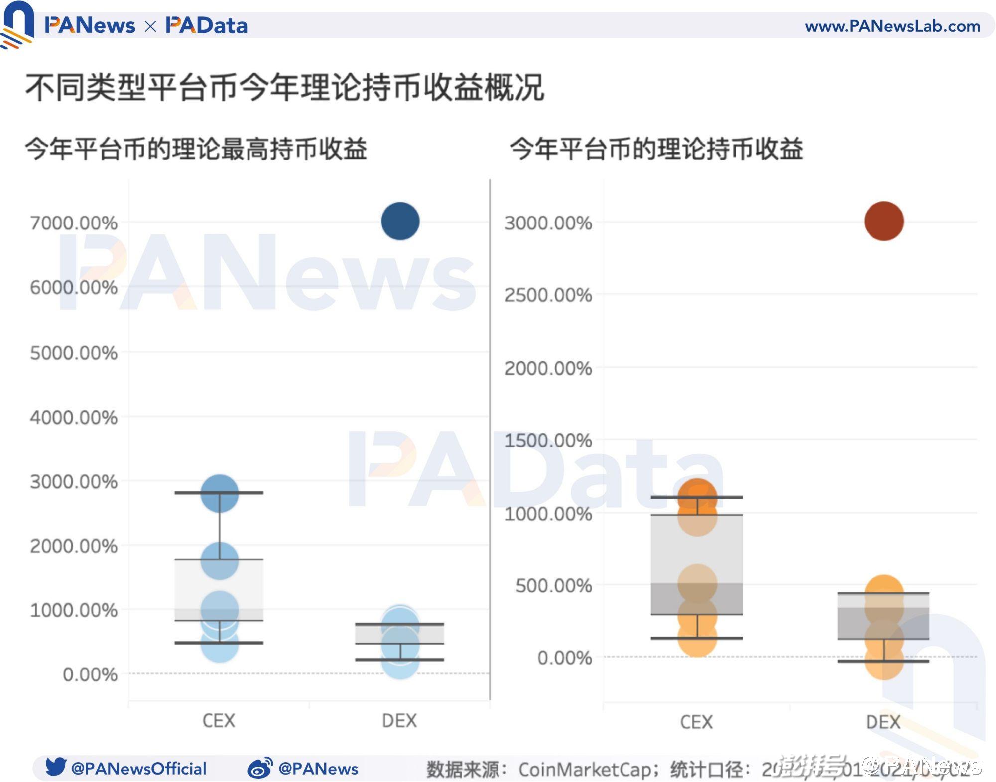 PAData以CEX平台币的市值和DEX的锁仓额为基准挑选了10种热门平台币,包括BNB、HT、OKB、FTT、KCS、UNI、SUSHI、CAKE、BAL和MDX,统计其预期收益率后发现,今年,10种平台币的平均(中值)理论持币收益约为387%,平均(中值)最高理论持币收益率约为790%。