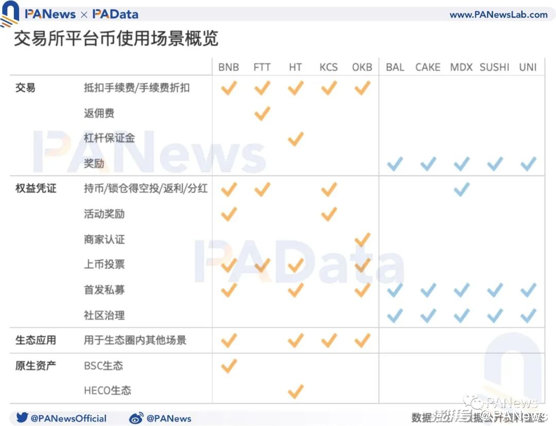 平台币的收益表现与其价值来源密不可分,而价值来源则主要取决于其应用场景的广度和深度。PAData分析了当前各平台币的使用场景后发现,目前,CEX平台币的应用场景较DEX治理代币更广泛,这为CEX平台币预期收益的持续良好表现提供了支撑。