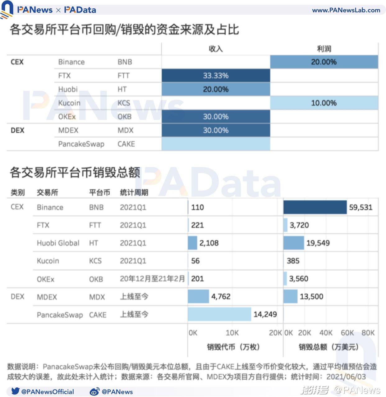 回购销毁是CEX提升平台币价值的主要手段之一。根据PAData的统计,当前CEX回购平台币的资金主要来源于收入或利润,占比通常在10%-30%左右。今年一季度,Binance回购销毁总额最多,约为5.95亿美元,HT回购销毁了1.95亿美元,FTT和OKB也都回购销毁了3500万美元以上。