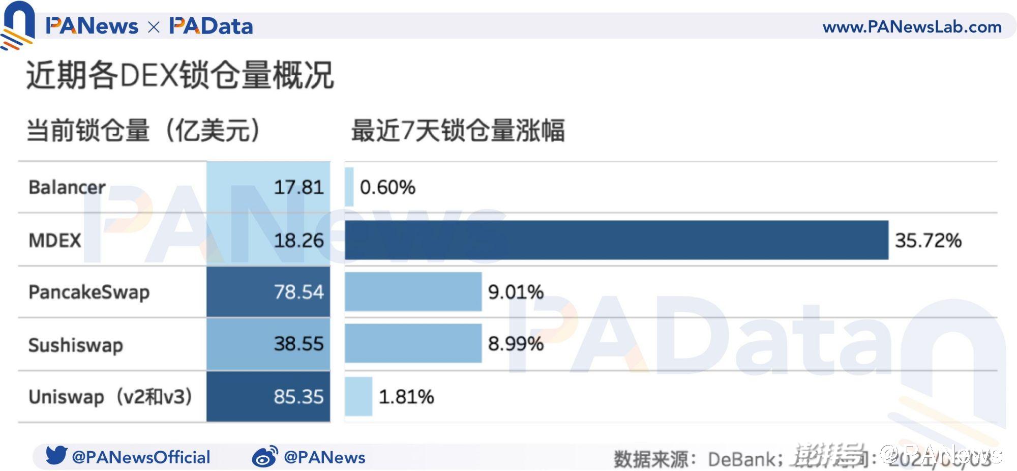 MDX通过回购/销毁、减半、锁仓奖励、代币首发、在线治理等多重赋能创造了理想的上升预期,这与MDEX的快速发展形成了积极的正向循环。根据DeBank的数据,截至6月3日,MDEX的锁仓额(仅BSC版)已经达到18.26亿美元,在所有DeFi协议中排名第12位,在BSC上的DeFi中排名第3位。总的来说,在上线不到半年时间里,其锁仓额的表现可圈可点。