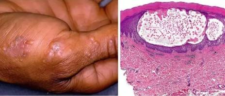 这是一种发生于手掌、手指侧面、指端皮肤的复发性水疱病,属于湿疹的一种,疱液清澈发亮,干涸后会出现蜕皮。